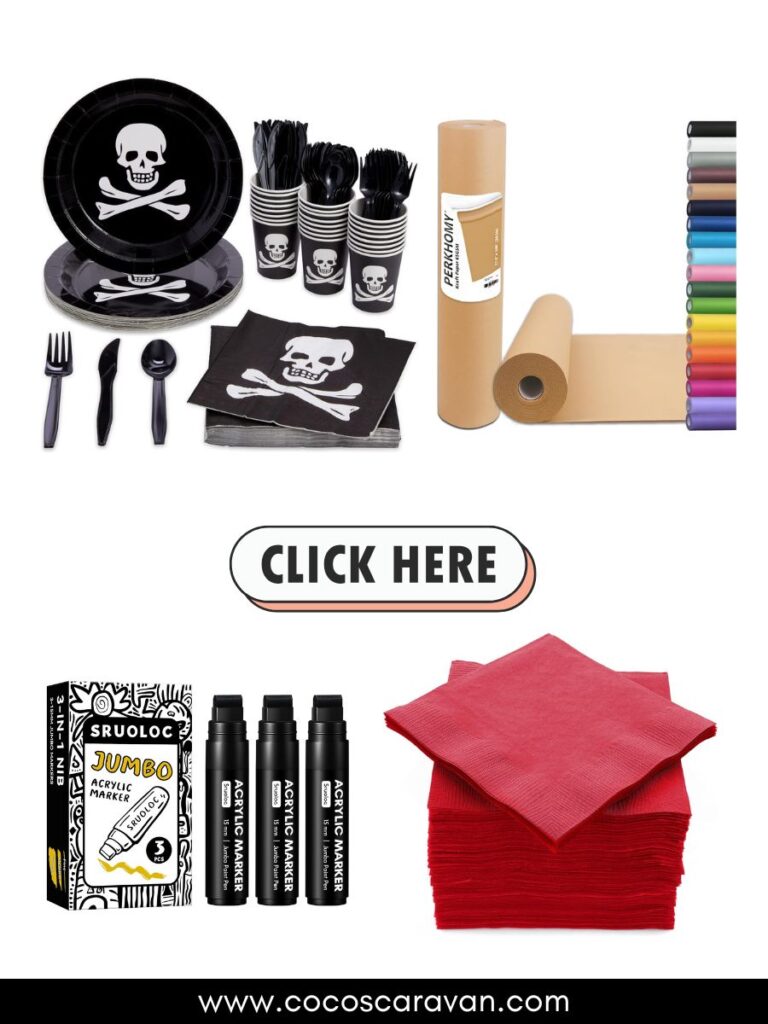 I love setting up a kids table just for the birthday pirate and their crew. I absolutely adore creating the perfect atmosphere for a pirate-themed birthday party, especially when it comes to the pirate party table decorations! I started by laying out treasure map plates and striped napkins for the little buccaneers to enjoy their pirate feast. Then, I transformed the table into a mini pirate adventure with gold coins, treasure chests, and fun pirate props. It’s pure joy watching the kids light up as they dive into their food and pretend play right at the party table.