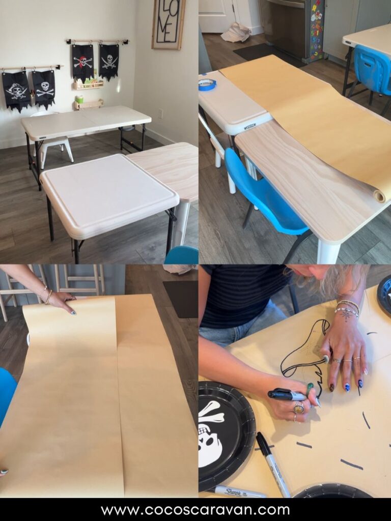 For the kids’ table, I rolled out a long sheet of brown kraft paper as the table covering and secured it with blue tape so it stayed in place. Before decorating, I set the plates down in each spot and traced around them, then sketched my designs in pencil before going over them with permanent marker. It was such a fun DIY touch! During the party, I put out crayons so the kids could color in the drawings and add their own pirate-inspired doodles. The paper made the perfect backdrop for crafts too, and when the party was over, cleanup was as simple as rolling it up and tossing it out.