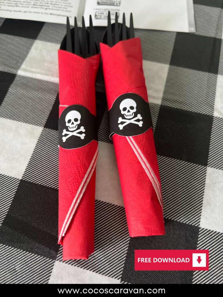 To dress up the table, I printed pirate-themed napkin rings and used my Silhouette machine to cut them out it saved me so much time! After wrapping the utensils in red napkins, I simply taped the napkin rings on. It was such an easy DIY detail that added a fun pirate touch to the place settings. You can download and print these napkin rings for free—see below!